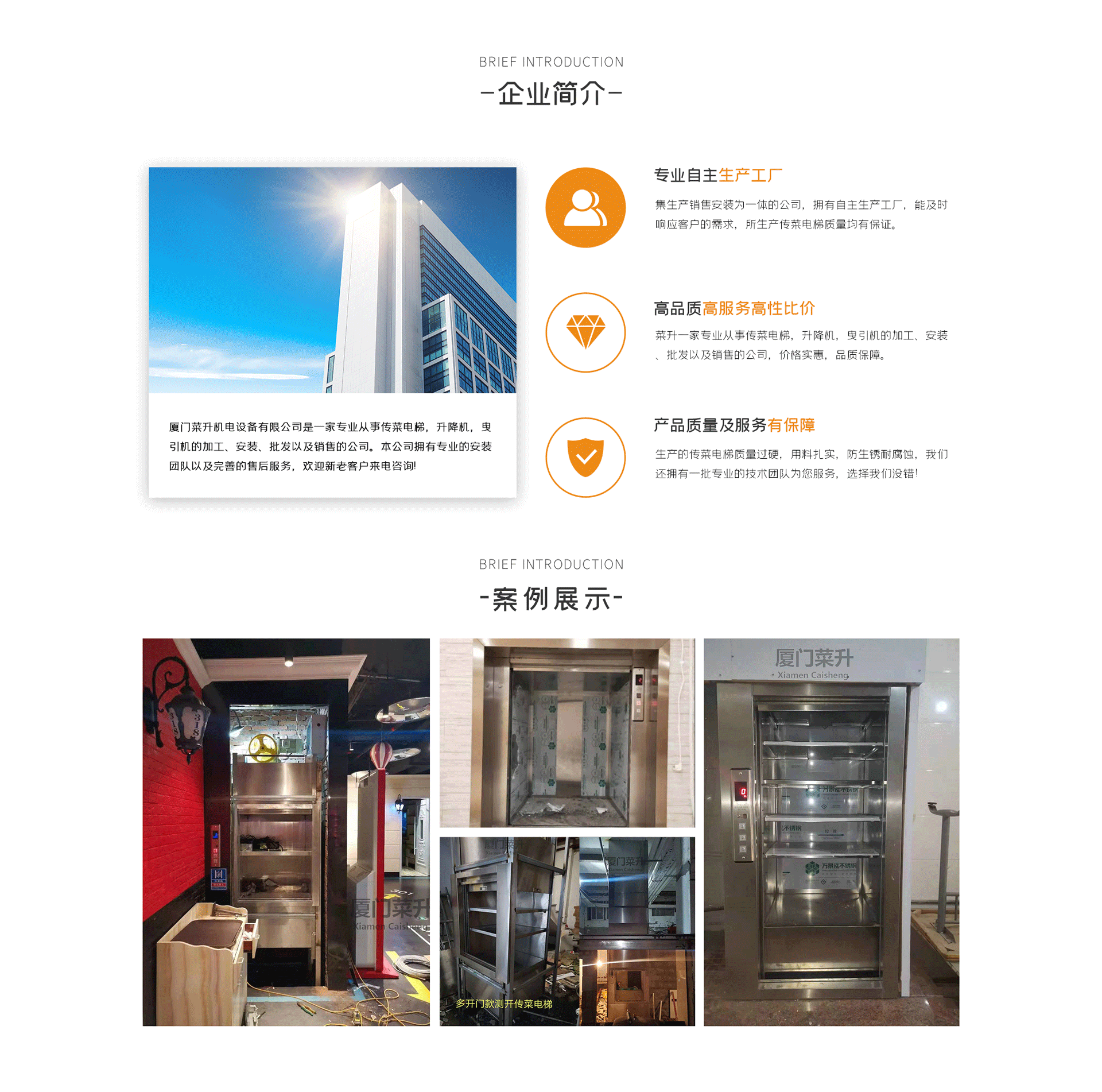廈門(mén)菜升機(jī)電設(shè)備有限公司是一家專(zhuān)業(yè)從事傳菜電梯,升降機(jī),曳引機(jī)的加工、安裝、批發(fā)以及銷(xiāo)售的公司。源頭工廠(chǎng)制造安裝,提供各種規(guī)格尺寸及定制咨詢(xún)?cè)O(shè)計(jì)服務(wù)。本公司生產(chǎn)的傳菜電梯品質(zhì)有保障,安全可靠,擁有專(zhuān)業(yè)的安裝團(tuán)隊(duì)以及完善的售后服務(wù),可全國(guó)發(fā)貨全國(guó)聯(lián)保,歡迎新老客戶(hù)來(lái)電咨詢(xún)!